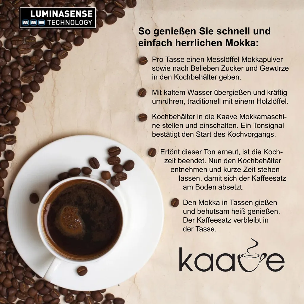 Wer selbst schon einmal Mokka zubereitet hat, weiß wie schnell es passiert, dass er überkocht oder der Mokkaschaum ansteigt und „überläuft“. Hier hat Fakir mit der „Luminasense“-Technologie eine Innovation entwickelt, die bei der Mokkamaschine ein Überkochen verhindert.