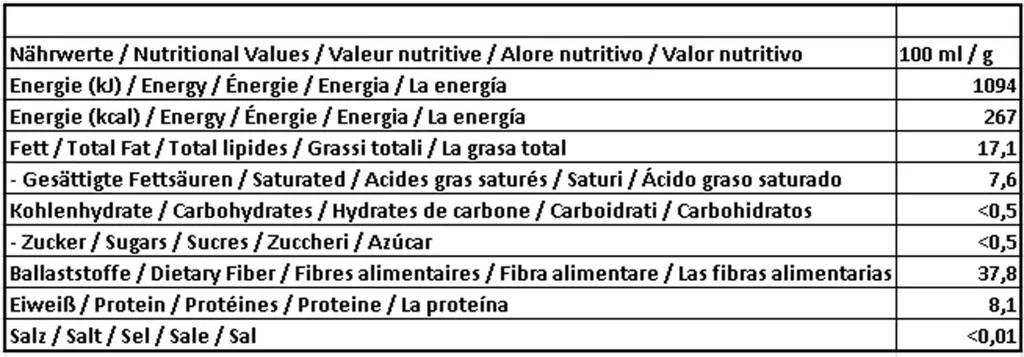 | Ballaststoffe | 37,8 g | < 0,5 g | |