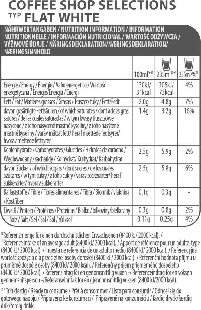 - Zutaten: Sahne (aus MILCH) (43%), gemahlener Röstkaffee (25%), Zucker, MILCHPROTEINE, Wasser, MILCHMINERALIEN, Salz, Verdickungsmittel (E414), Säureregulator (E331)