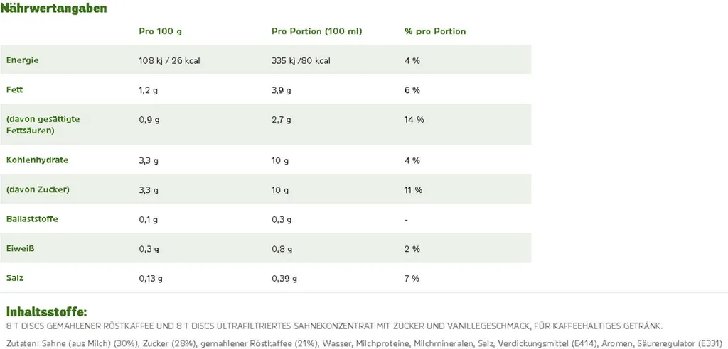 TASSIMO Latte Macchiato Vanilla Kaffeekapseln: die Vanille-cremige Komposition für den besonderen KaffeegenussSie sind Latte Macchiato-Liebhaber und mögen außerdem das sahnig-süße Aroma von Vanillie? Dann dürften die TASSIMO Latte Macchiato Vanilla Kaffeekapseln genau nach Ihrem Geschmack sein.Feinster KaffeegenussGeeignet für Tassimo Kapselmaschinen zaubern Sie mit ihnen auf Knopfdruck Ihr Wunschgetränk. Ob für den besonderen Genussmoment am Morgen oder als besonders cremiges Heißgetränk in der Mittagspause – die TASSIMO Latte Macchiato Vanilla Kaffeekapseln sind ein Muss für alle Tassimo-Fans.Für Angaben gem. der Lebensmittelinformationsverordnung klicken Sie bitte hier.Nährwertinformationen pro 100gEnergie 108/26Fett 1,2 gdavon gesättigte Fettsäuren 0,9 gKohlenhydrate 3,3 gdavon Zucker 3,3 gBallaststoffe 0,1 gEiweiß 0,3 gSalz 0,13 g
