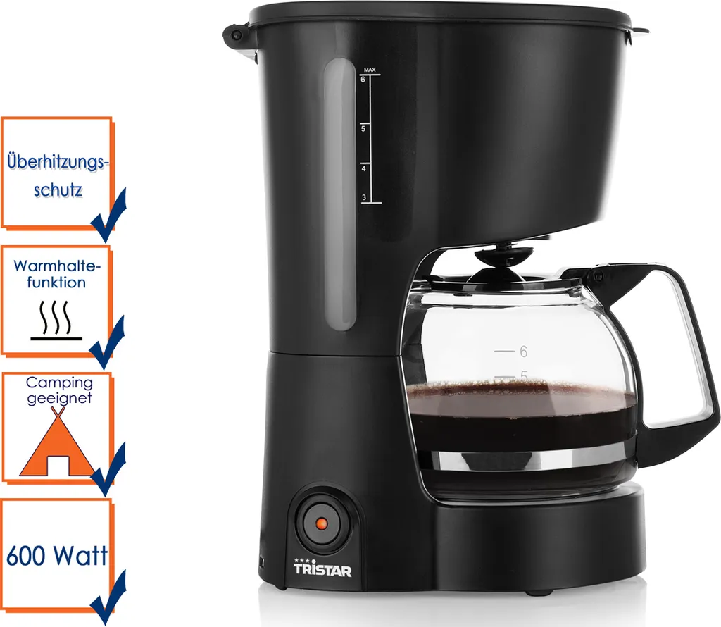 Der Kaffeeautomat ist ein kompaktes und elegantes Gerät in mattschwarzem Design. Mit 600 Watt Leistung eignet sich der Kaffeeautomat auch für den Campingeinsatz. Dank seiner kompakten Größe lässt er sich überall mit hinnehmen. Die Kaffeemaschine hat einen Dauerfilter, der sich leicht reinigen lässt; d. h. Sie brauchen keine Filtertüten mehr.